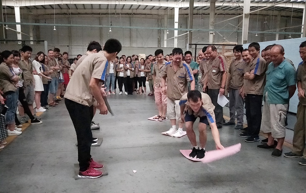 隨著一聲“比賽開始”的口令,大家熱情高漲,隊員們齊心協力,奮力拼搏,有些隊剛開始有點緊張,所走路線成彎曲狀,后來,在大家從旁提醒,順利到達終點。有些隊吸取經驗,通過簡單的交流和溝通戰略技巧,比較順利。相比而言,后面的組明顯比前面的組速度快。在整個比賽過程中,里料車間團隊協作的能力和靈活的戰術配合比較好,本著“友誼第一、比賽第二”的精神,經過激烈角逐,里料車間以2分25秒完成了60米“搭橋過河”獲比賽第一名,包裝車間獲得第二名,技術部獲得第三名。